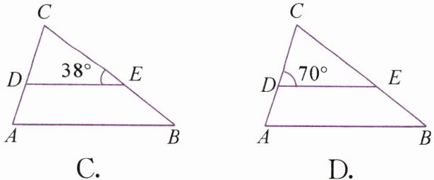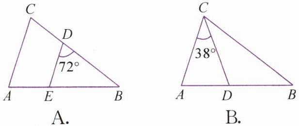 1. 如图,在纸片△ABC 中,∠A=72°,∠B=38°,将纸片△ABC 沿某条直线剪开. 下列四种方式中,则剪下的三角形与△ABC不相似的是 (