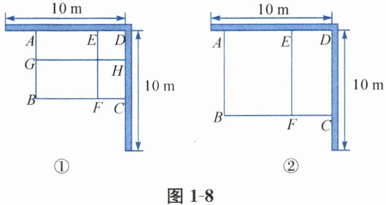 变式4-2 如图1-8①,有两面互相垂直且长度均为10m的墙,现要建一个矩形花圃ABCD,矩形两边由墙围成,另两边和中间隔离带用篱笆围成,篱笆总长24m,隔离带EF,GH均与接触的墙垂直.