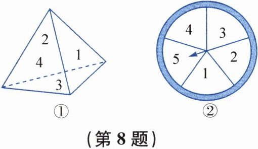 8. 随机抛掷图①中均匀的正四面体(正四面体的各面依次标有1,2,3,4四个数字),并且自由转动图②中的转盘(转盘被分成面积相等的五个扇形区域),则正四面体着地的数字与转盘指针所指区域内的数字之积为偶数或奇数的可能性哪个大?