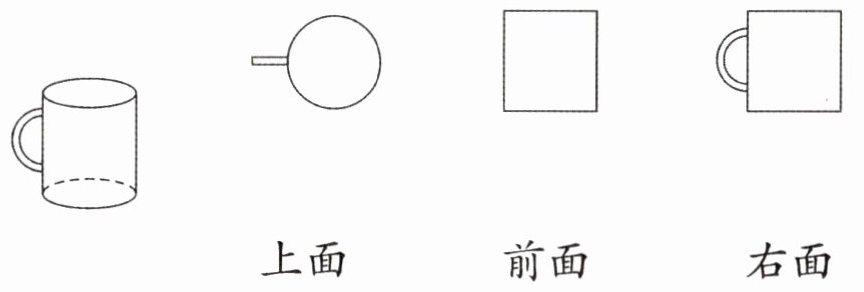 1. 下面是一个杯子,从上面、前面和右面看到的各是什么图形?用线连一连。