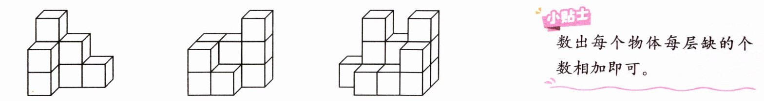 5. 下面各立体图形,至少再添多少个小正方体才能摆成长方体?填一填。