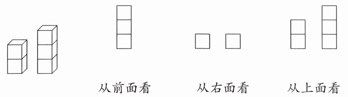 (2)右边给出的图形分别是左边立体图形从哪一面看到的? 在括号里填一填。(填“前”“右”或“上”)