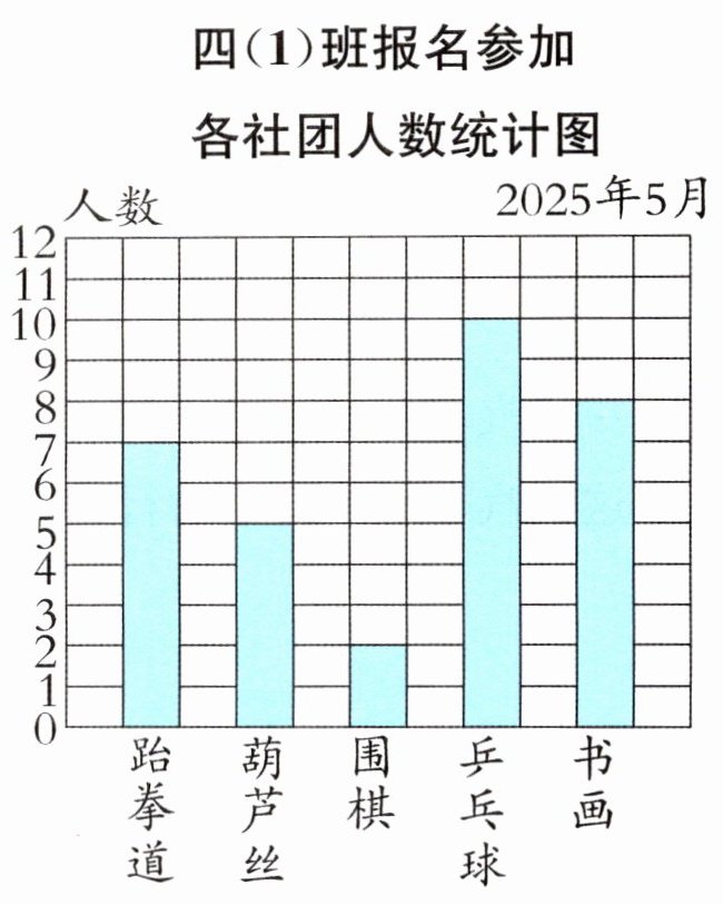 1. 为了丰富课后服务的内容,东林小学开展了多个社团,下面是四(1)班报名参加各社团人数的统计图。