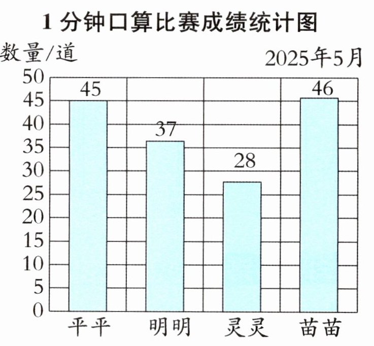 2. 平平、明明、灵灵和苗苗是一个小组的同学。他们进行1分钟口算比赛,右下图是他们各自答对题数情况统计图。