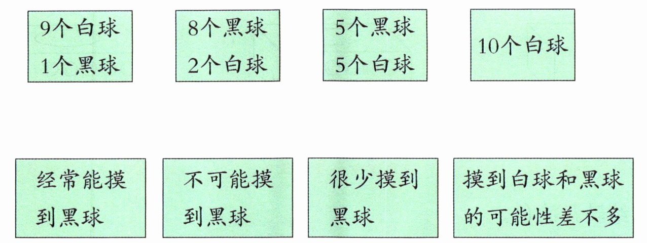 (3)2个绿球、1个绿球和1个白球、1个绿球和1个红球、1个白球和1个红球、2个红球。 提示 盒子里只有1个白球,不可能同时摸出2个白球。写可能出现的情况时要按一定的规律,不重复、不遗漏。