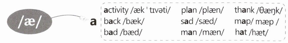 /æ/ a activity /ækˈtɪvəti/ plan /plæn/ thank /θæŋk/ back /bæk/ sad /sæd/ map /mæp/ bad /bæd/ man /mæn/ hat /hæt/