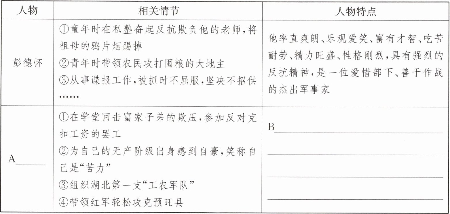 | A______ | ①在学堂回击富家子弟的欺压,参加反对克扣工资的罢工②为自己的无产阶级出身感到自豪,笑称自己是“苦力”③组织湖北第一支“工农军队”④带领红军轻松攻克预旺县 | B______ |