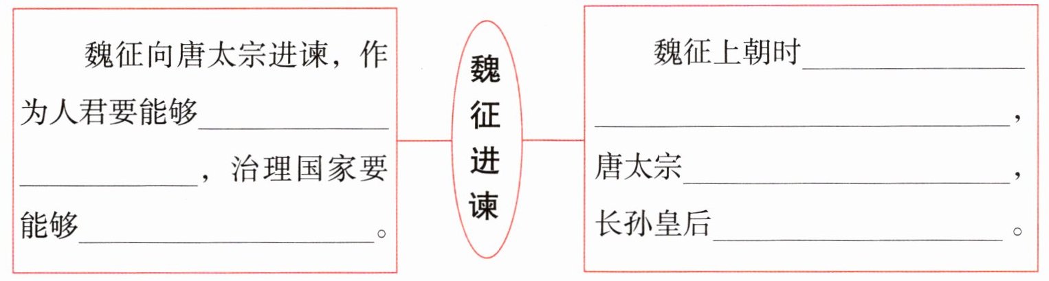 | 魏徵向唐太宗进谏,作为人君要能够______,______,治理国家要能够______。 | 魏徵进谏 | 魏徵上朝时______,______,唐太宗______,长孙皇后______。 |