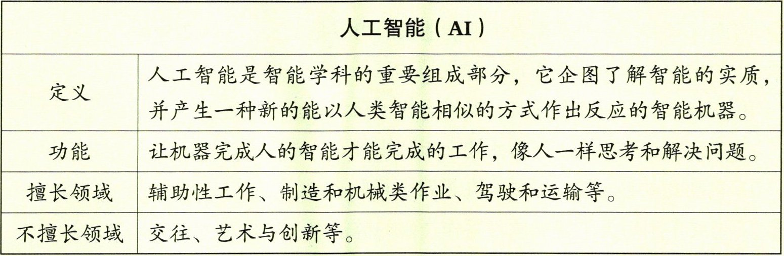 | 功能 | 让机器完成人的智能才能完成的工作,像人一样思考和解决问题。 |
