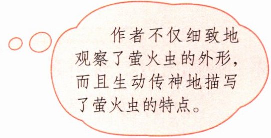 我还记得第一次看见萤火虫的情景。在某个果园的山坡上,我看见一只艳丽的甲虫正在草丛中拼命地向高处爬。爬到最高处,它突然弹开鞘(qiào)翅,张开半透明的柔软翅膀,飞了起来。我注意到,它有着漆黑的甲壳,橙红的背板,细长的触角,就像一个戴着红色头盔的武士。它背后不时扇动的翅膀,使它看起来更像一个神话中的角色。