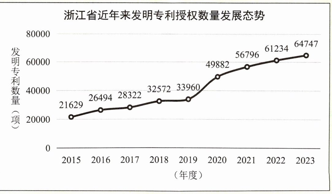 材料二 浙江省2015—2023年度发明专利授权数量趋势表