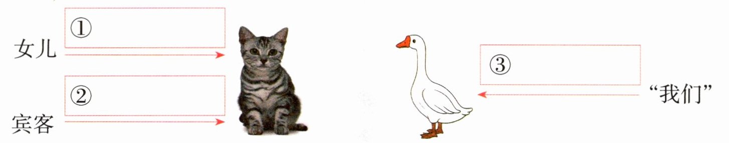 4 两篇选文中,人物对猫或鹅的态度分别是怎样的?借助关键词句,完成下图。(3分)