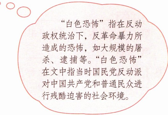 “白色恐怖”指在反动政权统治下,反革命暴力所造成的恐怖,如大规模的屠杀、逮捕等。“白色恐怖”在文中指当时国民党反动派对中国共产党和普通民众进行残酷迫害的社会环境。