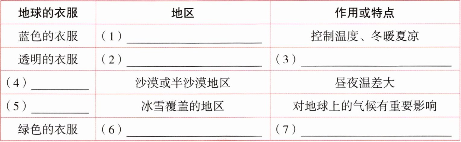 1 本文主要介绍了地球的哪些“衣服”?其特点、作用是什么?根据短文,完成表格。(7 分)