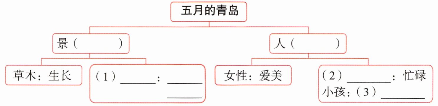 1 【语文要素】本文围绕“五月的青岛”,从景和人两个方面来描写,请把下面的内容补充完整,并体会静态描写和动态描写,把序号填入“景”或“人”后面的括号内。(5分)