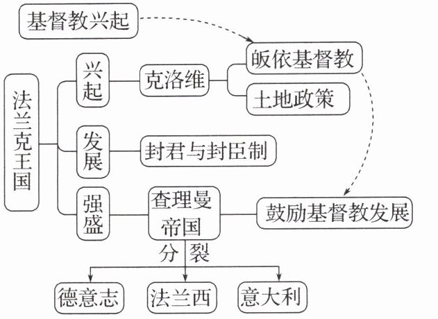 C 结合所学知识可知,材料中称克洛维"蛮族"首领指的是481年克洛维建立法兰克王国,称克洛维"圣徒"国王指的是他为了稳固统治,皈依基督教,C正确;而A、B不符合材料,排除;建立封建等级制度是在8世纪前期,D不符合题意,排除。