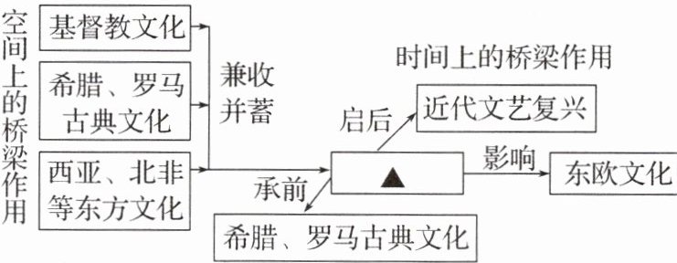D 拜占庭帝国地跨亚、欧、非三大洲,对基督教、希腊罗马的古典文化传统,以及西亚、北非等地的东方文化因素兼收并蓄,创造出了独具特色的拜占庭文化,对东欧文化产生深远影响,并且它保存的大量希腊、罗马古籍,为后来西欧的文艺复兴提供了丰富的精神营养。