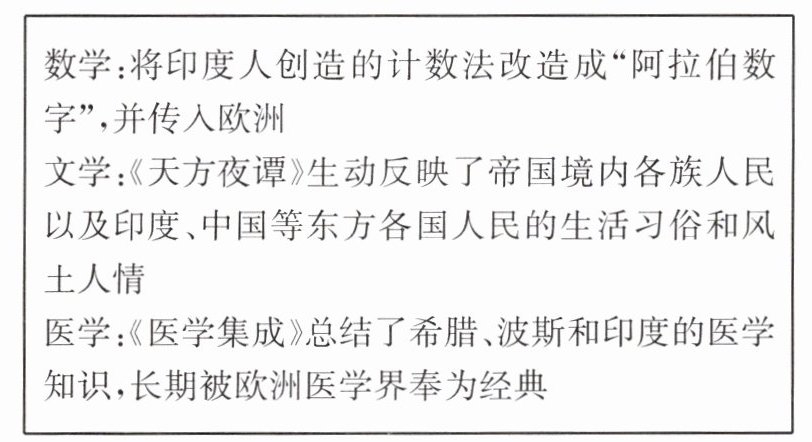 D 根据题干材料可知,阿拉伯文化兼收并蓄,总结、吸收了东西方文化,阿拉伯人还将东方科技传到欧洲,这反映了阿拉伯帝国沟通东西方文化。