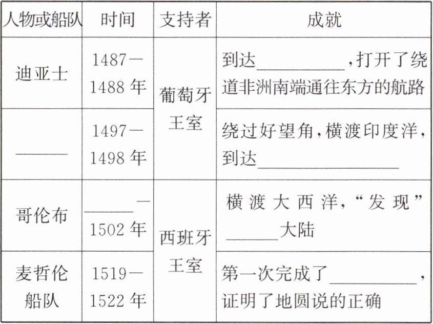 (2)条件:人们逐渐相信地球是圆的;中国人发明的指南针用于“罗盘”导航技术传到了欧洲;欧洲的造船技术取得重大突破。