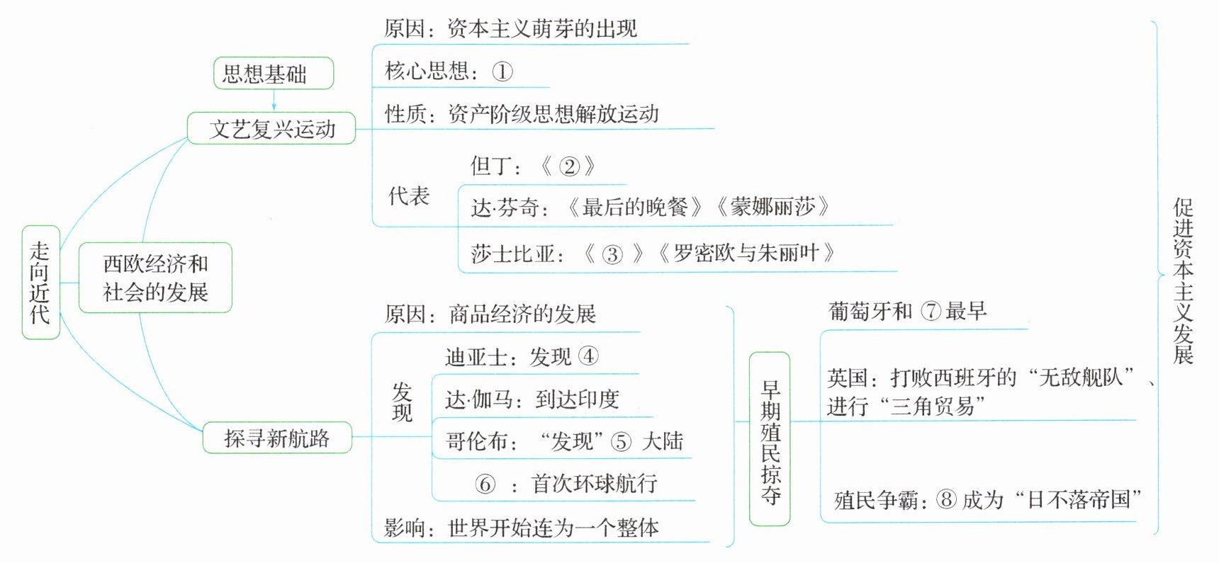 ①人文主义 ②神曲 ③哈姆雷特 ④好望角 ⑤美洲 ⑥麦哲伦船队 ⑦西班牙 ⑧英国