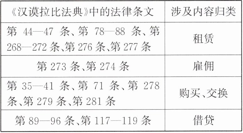B 题干材料反映的《汉谟拉比法典》内容主要包括:租赁、雇佣、购买、交换、借贷,这些都与财产和商业活动有关,由此可以说明当时古巴比伦商业贸易繁荣,商品经济活跃。