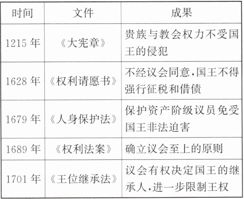 A 英国在资产阶级革命前后,颁布了一系列法律推动宪政进程,从内容看具有渐进式变革的特点。这些法律多是围绕国王与议会的关系,王权受到限制,而议会的权力逐步扩大,故选A;英国确立的是君主立宪制,排除B;材料主要涉及英国宪政发展的进程,并未提及具体的推动力量,排除C;材料中英国宪政进程时间相对较长,排除D。