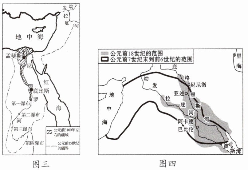 (3)根据材料三中的图三、图四,分别说出亚非早期文明的典型国家。(4 分)并分析亚非早期文明出现在大河流域的原因。(2 分)