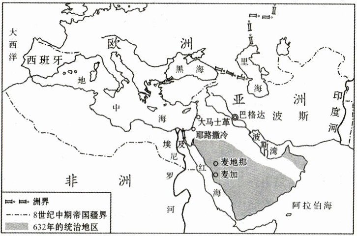13.(2024·武汉江岸模拟)古代文明的扩展,促进大帝国的兴起。下图是公元8世纪某帝国全盛时期的疆域。据此判断该帝国是(