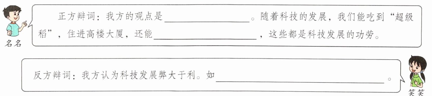 五、同学们就“科技是否是一把双刃剑”发表了自己的看法,那科技发展到底是利大于弊,还是弊大于利呢?请你参与辩论。