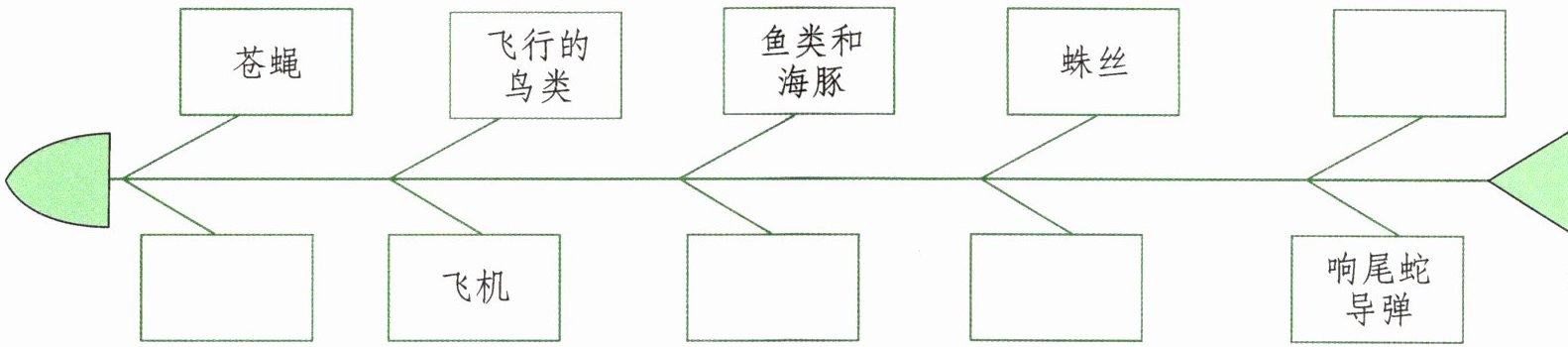 ②你知道飞机与鸟类的关系吗?实际上,飞机的出现,来自对飞行鸟类的直接模仿。船和潜艇来自人们对鱼类和海豚的模仿。生物学家对蛛丝进行研究,制造出临时吊桥用的高强度绳索。响尾蛇导弹,就是模仿蛇的热眼功能和其舌上排列的一种类似照相机装置的天然红外线感知能力,研制开发出来的现代化武器。