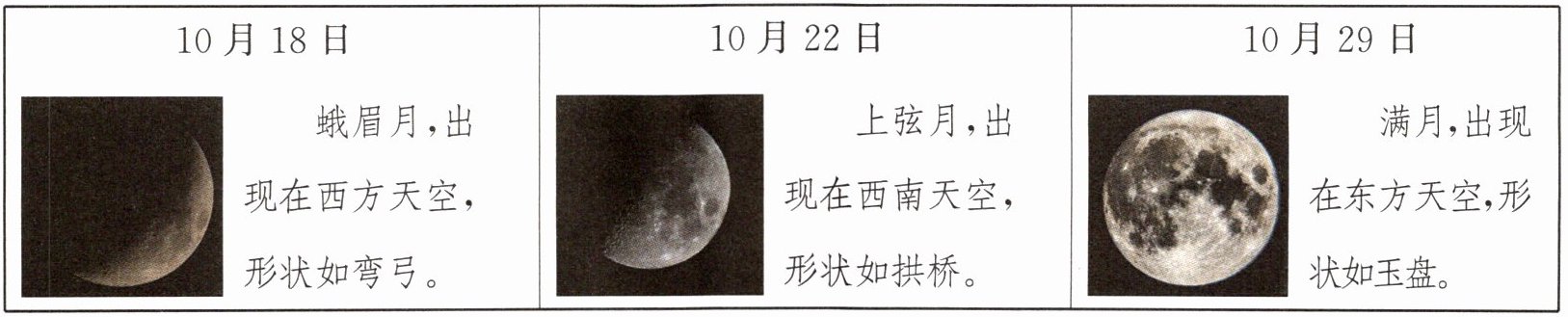 |蛾眉月,出现在西方天空,形状如弯弓。|上弦月,出现在西南天空,形状如拱桥。|满月,出现在东方天空,形状如玉盘。|