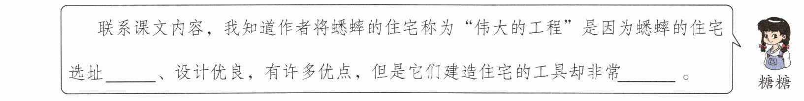 联系课文内容,我知道作者将蟋蟀的住宅称为“伟大的工程”是因为蟋蟀的住宅选址______、设计优良,有许多优点,但是它们建造住宅的工具却非常______。