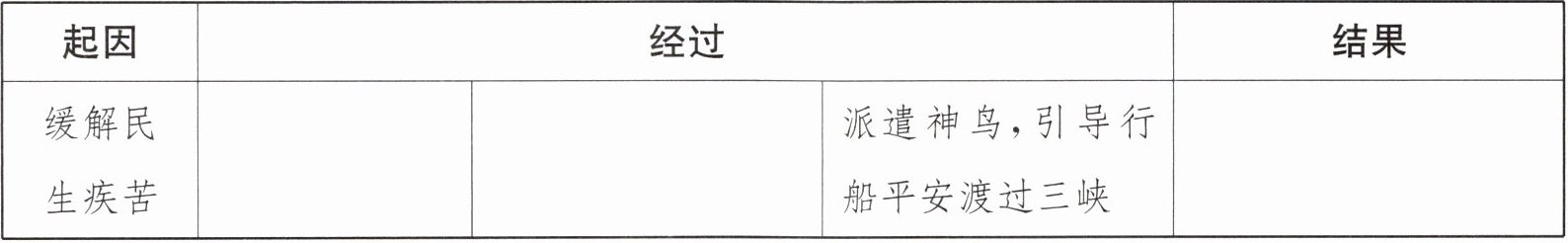 | 缓解民生疾苦 | ______ | 派遣神鸟,引导行船平安渡过三峡 |