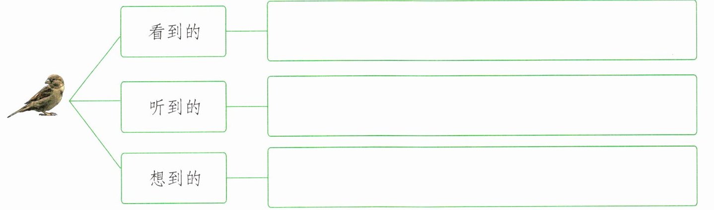 2. 看到的:一只大麻雀对着小麻雀叫着跳着,小麻雀用乞求的目光望着“我” 听到的:叽叽喳喳的鸟叫声 想到的:这大概就是小麻雀的妈妈吧
