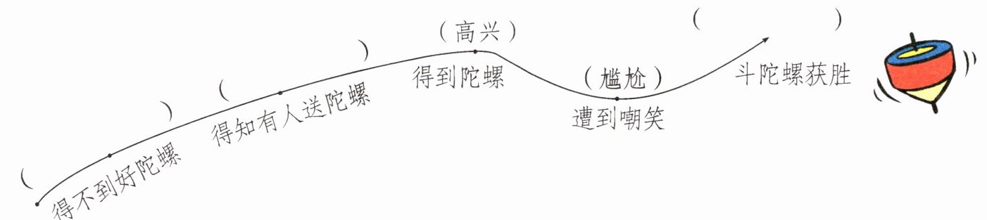 ( )←——得不到好陀螺 ( )←——得知有人送陀螺 (高兴)←——得到陀螺 (尴尬)←——遭到嘲笑 →——( )←——斗陀螺获胜
