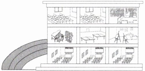 There are twenty classrooms in the teaching building. My classroom is on the first floor. There is an art room and a music room on the second floor. There are two computer rooms on the third floor. Our library is on the third floor too. There are many books and magazines. I often read books and do my homework in the library. We don't have a gym, but we have a nice table tennis room. It's on the second floor. We also have a big playground. It's beside the teaching building. I love my school.