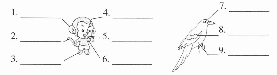 1. ear 2. tail 3. foot 4. nose 5. mouth 6. arm 7. eye 8. wing 9. body