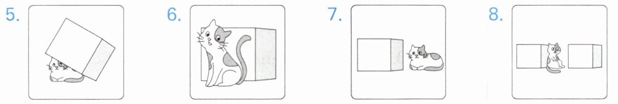 1. on 2. in 3. above 4. behind 5. under 6. in front of 7. beside/next to 8. between
