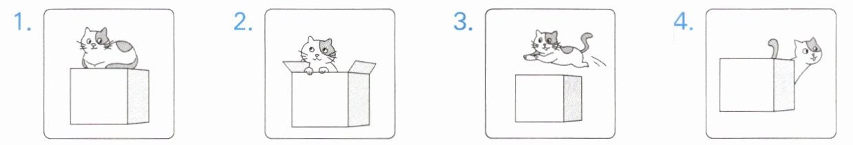 一、小猫咪在盒子的哪里呢?请观察图片,在横线上写出对应的方位介词(组)。