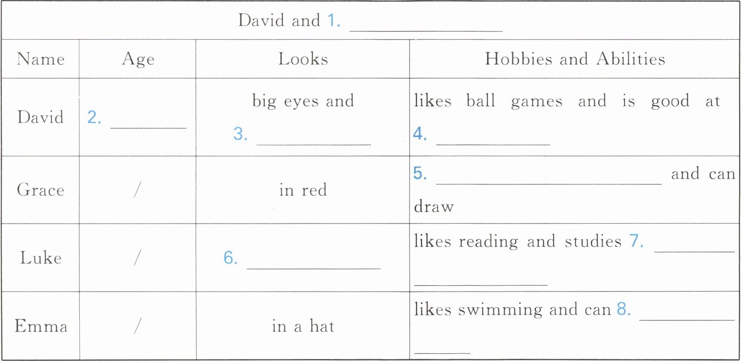 1. his friends 2. 13/thirteen 3. brown hair 4. basketball/playing basketball 5. likes dancing 6. in a white T-shirt 7. Chinese at home 8. swim fast