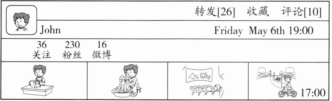 下面是John在某社交软件上记录的自己在上一个五一国际劳动节那天的活动,请你根据所给内容写一篇短文,以John的口吻描述一下他都做了些什么。