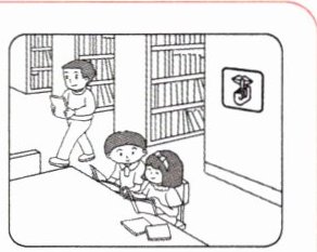A: Look at the ______ over there. It means they can't ______ loudly in the library.