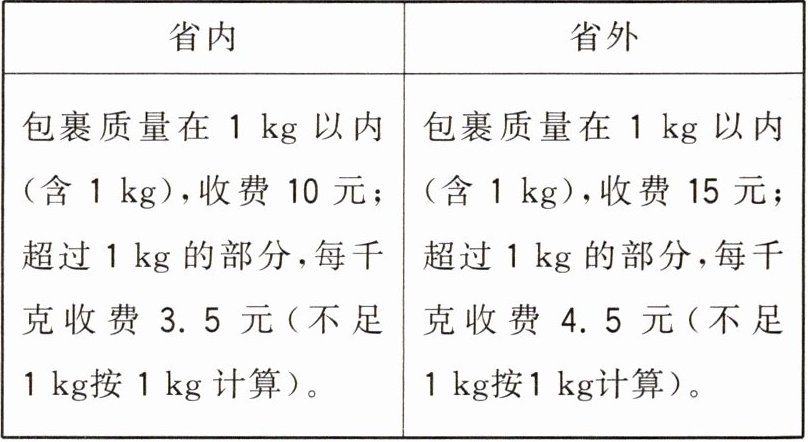 | 包裹质量在1 kg以内(含1 kg),收费10元;超过1 kg的部分,每千克收费3.5元(不足1 kg按1 kg计算)。 | 包裹质量在1 kg以内(含1 kg),收费15元;超过1 kg的部分,每千克收费4.5元(不足1 kg按1 kg计算)。 |