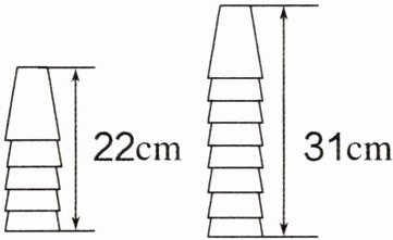 如图,5个杯子叠起来高是22 cm,8个杯子叠起来高是31 cm。