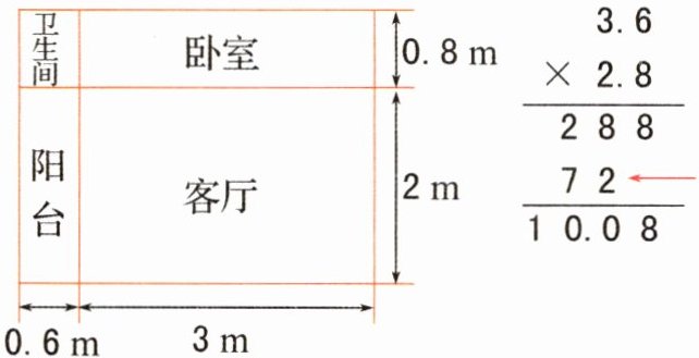 5下面是高飞房间的平面图。他用竖式计算出房间的面积,竖式中箭头所指的数计算的是哪一块的面积?