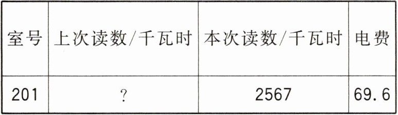 | 室号 | 上次读数/千瓦时 | 本次读数/千瓦时 | 电费 |