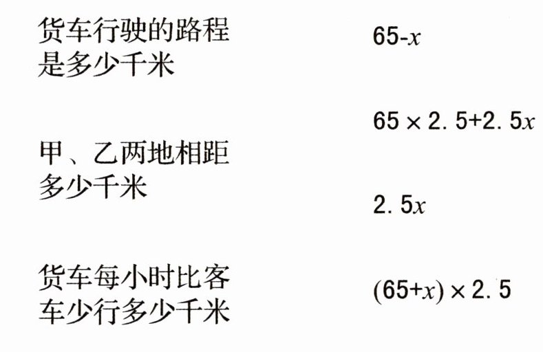 一辆客车和一辆货车同时从甲、乙两地开出,相向而行,经过2.5小时相遇。已知客车的速度是65千米/时,货车比客车的速度慢,每小时行驶x千米,______?请将左边的问题与右面相应的式子用线连起来。(可多连)