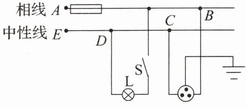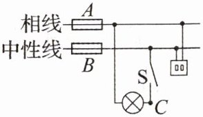 (选填“A”或“B”)保险丝断路。由于该电路连接存在错误,当开关 S 断开时,用测电笔检测点 C,氖管将 发光