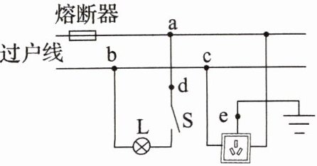 B.若e点所在导线断路,三孔插座仍可安全使用