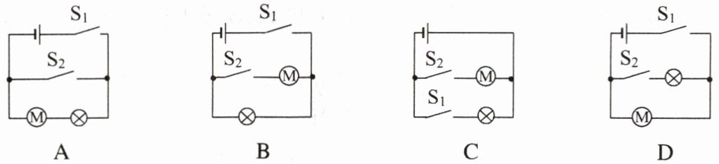 4. (电路的设计)小华想为家里厨房设计一个既能照明又能吹风的简易凉霸。当开关$S_{1}$闭合时照明灯亮起,当开关$S_{2}$闭合时电动机启动,吹出凉风,照明灯和电动机互不影响。下列电路设计符合要求的是( )
